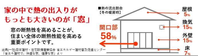 窓は熱が一番出入りしやすい場所です。冬は58%もの熱が逃げ出し、夏は68%もの熱が入り込んでいます。