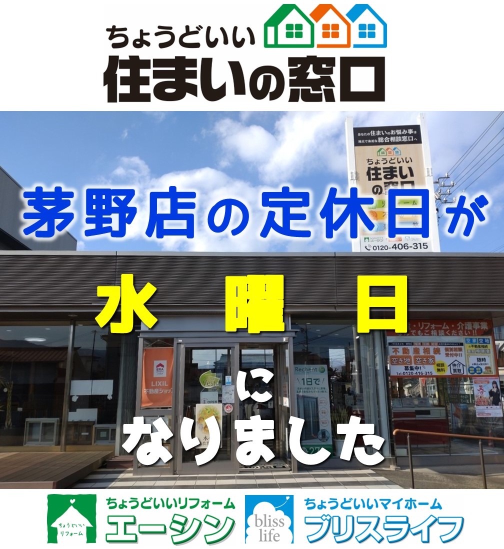 2023年8月より、エーシン茅野店の定休日が「水曜定休」になりました。